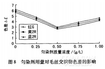 從圖8可看出,勻染劑質量濃度0.5g/L時,同色效果最好;用量過大,色差又變大。分析原因,勻染劑用量過大時,勻染劑在減少羊毛堿性基、降低其反應活潑性的同時,也影響了蠶絲的上染,達不到同色的要求。因此,勻染劑用量以0.5g/L較合適。