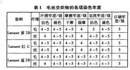 由表1可以看出,Lanaset系列染料一浴法染毛絲交織物的各項色牢度均較佳,達到4級以上。