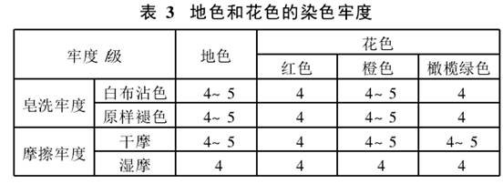 現以妃色為地色,紅、橙、橄欖綠三套色花型的棉/牛奶蛋白纖維拉舍爾毯為例,該產品的地色、花色的色牢度分別見表3。