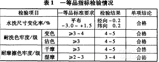 依據GB/T4l1_2o08《棉印染布》一等品指標進行檢驗,結果見表1。