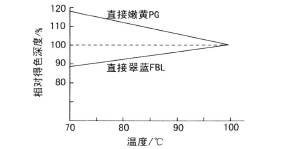 兩種染料在不同溫度(60~100℃)下的中性鹽浴中染色,溫度提高,直接耐曬嫩黃PG的得色深度降低,而直接耐曬翠藍FBL的得色深度增加(見圖1)。