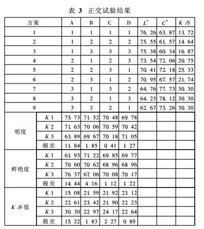 由表3可見,影響明度的因子主次順序為A1B1D3C2;影響鮮艷度的因子主次順序為A3B1D3C3;影響K/S值的因子主次順序為A3C3B2D1。綜合指標為ABCD。