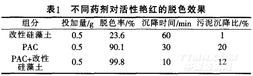 由表1可知.在相同條件下.復合絮凝劑的處理效果最好,PAC次之.改性硅藻土最差.沉降效果也依此順序下降。由于改性硅藻土吸附容量有限,加之呈粉體狀.不易固液分離.導致其脫色率較小。