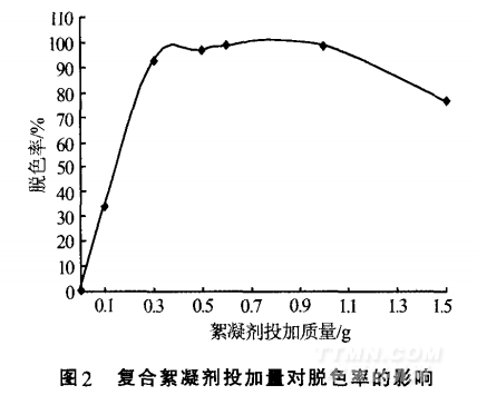由圖2可知.隨著復合絮凝劑投加量的增加.脫色率隨之上升。當復合絮凝劑投加質量達到0.5g時,脫色率接近100%,進一步增大投加量.脫色率沒有明顯變化,當投加質量增加到lg以上時.脫色率明顯下降這是因為聚合氯化鋁水解產物主要為Al(Ⅲ)多羥基絡合物.可通過電中和使污染物顆粒或膠體雙電層壓縮、(電位降低從而迅速脫穩。最終發生凝聚并沉降下來。如果加人過量的聚合氯化鋁,則污染物顆粒吸附過多的反離子.使所帶電荷變號.相互排斥,產生再穩現象。綜合考慮.合適的復合絮凝劑投加質量濃度為2.5g,L,下述實驗均采用該投加量。