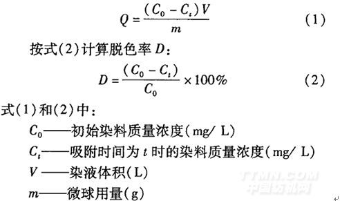 準確稱取一定量復合微球,加人到一定體積的酸性紅337水溶液中,用水浴恒溫振蕩器振蕩一定時間,測定溶液的吸光度,按式(1)計算吸附容量Q(mg/g):