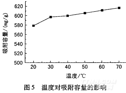 由圖5可知,復(fù)合微球?qū)λ嵝约t337的吸附是隨 溫度變化不大,在3O一7O℃吸附效果較好,考慮印染 廢水加熱處理能源成本太高,所以在300【=吸附最適合 印染廢水的實際處理需要。