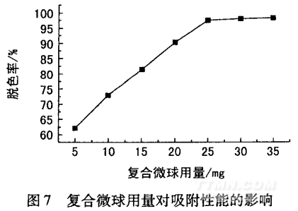 由圖7可知,復(fù)合微球用量增加,其對酸性染料的脫色率隨之增大,直至超過25 mg后,酸性染料的脫色率增加平緩。這是因為染料含量一定,微球吸附完畢,脫色率也達到最大值。