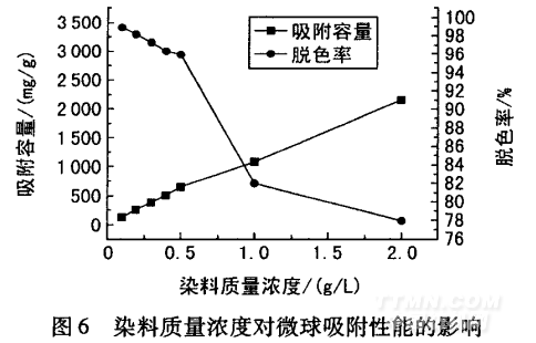 圖6中,隨染料質(zhì)量濃度的增加,微球吸附容量升 高,但染料脫色率下降。染料質(zhì)量濃度小于0.5 g/L時, 脫色率變化不大,說明復(fù)合微球?qū)λ嵝匀玖洗嬖诨瘜W(xué)吸 附,即定位吸附。這主要是由于復(fù)合微球上具有大量一 NH, ,它與酸性染料上的一SO3-,一發(fā)生定位吸附,具有朗 哥繆爾吸附特性。染料質(zhì)量濃度大于0.5 g/L時,隨濃 度的增加,復(fù)合微球?qū)λ嵝匀玖系奈饺萘坎粩嘣黾樱?但脫色率迅速下降,這主要是因為復(fù)合微球上存在大量 羥基、酰胺基等,能夠與酸性染料上的氨基、羥基等基團 形成氫建或范德華力結(jié)合,即酸性染料對復(fù)合微球存在 物理吸附,即非定位吸附,具有弗萊因德利胥吸附特性。 這說明復(fù)合微球作為酸性染料吸附材料,既適合吸附低 濃度染料廢水,又適合吸附高濃度染料廢水。