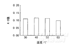 取水洗殘液100mL,以分別30℃、40℃、50℃、60℃的試驗溫度,在恒溫搖床上進行沾色試驗,時間為1h,計算K/S值。