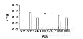 靛藍牛仔布沾色是因為靛藍染料再沉積作用造成的,加入表面活性劑或分散劑可以增加靛藍染料在本體溶液中的分散性能,從而減少其在織物上的沾附,減輕返染。采用不同的表面活性劑進行沾色試驗,取水洗殘液100,l使用恒溫搖床50℃處理60min,pH值為4.8,防沾色表面活性劑2g/L,測定相應數據,其中“空白1”是不加酶的,“空白2”僅加入酸性液體纖維素酶,AEO為脂肪醇聚氧乙烯醚。