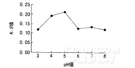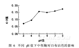 如前所述,不加酶時,改變溶液pH值對沾色的影響不大。但在實際生產中,不同pH值下沾色情況不同,是由于pH值對酶蛋白本身的影響造成的。其本質原因是酶蛋白跟纖維素纖維的不可逆吸附。