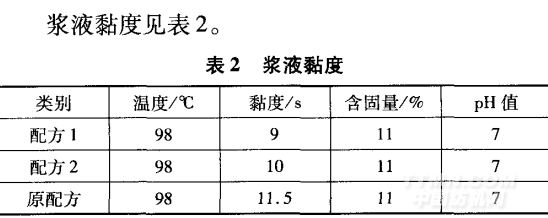 從表2可知,在相同條件下,配方1的漿液黏度較 小,根據(jù)上漿的機械狀況結(jié)合上漿理論,漿液在潤濕被 黏物表面時,深入到被黏物的表面的凹處或縫隙、小孔 固化后,形成了具有一定強度和彈性的固體,由于上漿 車速較快,所以要求漿液的滲透性要好。滲透性的好 壞與漿液的黏度有關(guān),漿液黏度小則滲透性好;反之則 滲透差,造成表面上漿,上漿率過低,從而嚴重影響紗 線的強力。用配方1形成的漿液黏度小,易滲透到纖 維內(nèi)部,上漿均勻,有利于上漿 。