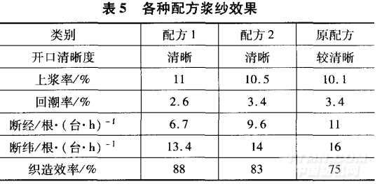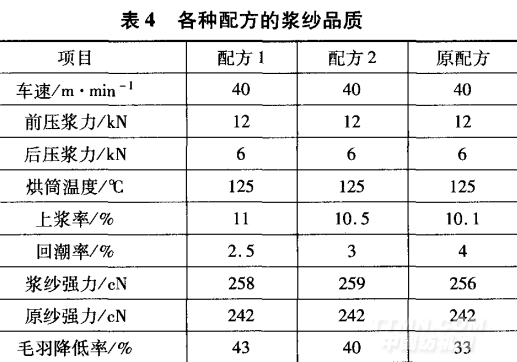 后壓漿力的大小關(guān)系到經(jīng)紗上漿率的高低,為了 提高上漿率,采用加大前壓漿力,同時減少后壓漿力的 方法,以增加滲透。從表4可知,用配方1的漿液漿 紗,上漿率明顯高于原配方,漿紗強力顯著增大,毛羽 率降低,所以固體丙烯酸漿料漿紗能達到較好的上漿 效果。 2.3漿紗效果對照