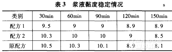 漿液黏度穩(wěn)定性的好壞,直接影響到上漿率的高 低,若漿液的黏度不穩(wěn)定,則所漿紗線上漿率高低不 勻,紗線強力不勻,會嚴重影響紗線質(zhì)量。從表3可 知,配方1的漿液隨時間的延長黏度變化不大,保持在 9 S左右,漿液穩(wěn)定性好,能保證上漿率的穩(wěn)定,從而漿 紗質(zhì)量穩(wěn)定。而原配方的黏度變化較大,漿液不穩(wěn)定。