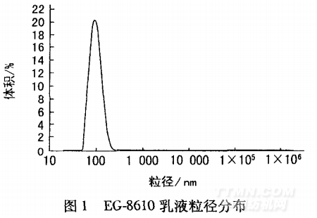 采用激光粒度儀測定EzGard EG一8610乳液粒徑分布,結果如圖1所示。