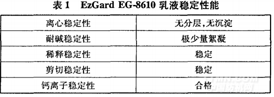 EzGard EG一8610乳液的各項穩定性能指標見表1。
