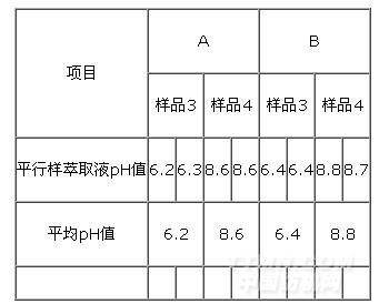 新標(biāo)準(zhǔn)引用了GB/T 6682-2008《分析實驗室用水規(guī)格和試驗方法》,將試驗用蒸餾水或去離子水的pH值范圍改為5.0~7.5,擴大了試驗用水的選擇范圍。本試驗選擇pH值分別為5.5和7.5的三級水(標(biāo)注為A和B)為萃取介質(zhì),對試驗樣品3和樣品4,進行萃取液pH值的測定,結(jié)果如下: