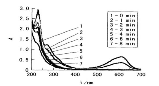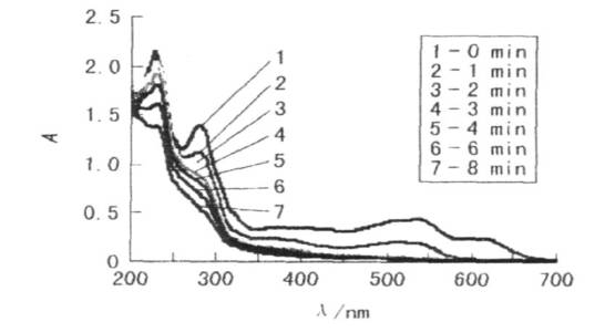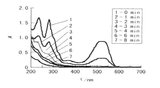 由圖6可見,經光電催化降解后,三原色及混合樣最大吸收波長處的波峰均消失了,這證明了溶液中染料被降解;在紫外區苯環的特征峰也消失了,證明苯環被打開,即光電催化氧化較徹底。