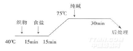 活性染料X%,食鹽60g/L,純堿20g/L,浴比1∶30。