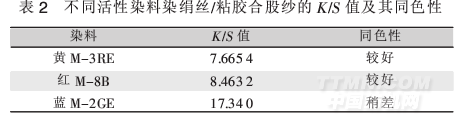 2.1.2不同染料染絹絲/粘膠合股紗的表面深度(K/S)及其同色性選黃M-3RE、紅M-8B、藍M-2GE這3只染料分別染絹絲/粘膠合股紗,然后用電腦測配色儀測定其表面深度(K/S),比較這3只染料在這2種纖維上的同色性,其結果見表2。