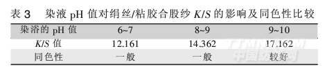 選活性藍M-2GE,用常規活性染料染色工藝染絹絲/粘膠合股紗,改變染液的pH值(染液的pH值分別用碳酸氫鈉、碳酸鈉等調節),用電腦測配色儀測定合股紗的表面深度(K/S),比較2種纖維上的同色性,結果見表3。