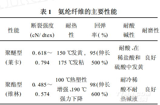 氨綸纖維主要化學組成是聚氨基甲酸酯,由低分子二異氰酸酯與低分子二羥基化合物反應制得高熔點易結晶的“硬段”, “軟段”是由長鏈二羥基化合物(大分子二醇)制得,它又可分為聚醚二醇和聚酯二醇兩類,根據分子鏈中軟鏈段的聚酯和聚醚,聚氨酯纖維可分為聚酯類和聚醚類。它是一個具有強大的分子間力的大分子網狀結構,有規則的結晶剛性鏈段和無規則的結晶柔性鏈段呈無規則的纏結狀態,如加以外力,則柔性鏈段變成有規則的狀態,此時它又力圖恢復原來的纏結狀態,因此具有高彈性能。氨綸纖維一般為復絲,單絲間不易分離,其間留有空隙,故手感較柔軟,其纖度范圍在22~4478dtex,最細為11dtex。其主要性能見表1。