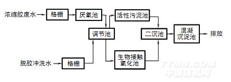絲脫膠廢水為較高濃度的有機(jī)性廢水,可生物降解性能較好。濃脫膠廢水的濃度指標(biāo)一般COD為5000~10000mg/L,BOD5為2500~5000mg/L,pH值為9.0~9.5。一般脫膠高濃度廢水水量較少,而脫膠沖洗水量較大,水質(zhì)濃度較低,其COD為500~1000mg/L,BOD5為300~600mg/L。一般采用分質(zhì)處理后再混合處理,或全部廢水直接混合后再進(jìn)行處理,分質(zhì)治理流程見下圖。