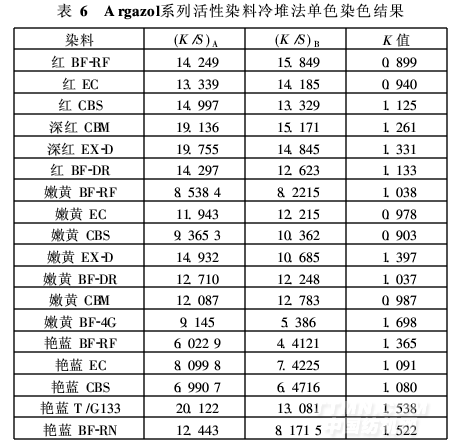 由表5知,Argazol系列活性染料單色浸染除艷藍TG 133%和嫩黃PT-4G、BF-4G染料以外,其它染料普遍存在的缺陷是粘膠面色光比棉面深,同色性效果不理想,要達到更好的同色性,就必須減少染料在粘膠纖維上的上染或增加染料在棉纖維上的上染。