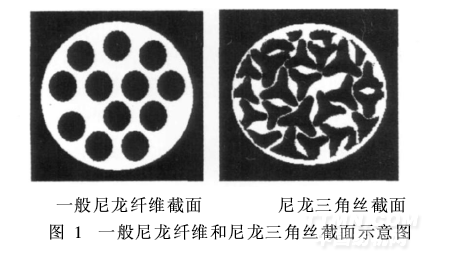 尼龍三角絲與一般尼龍纖維不同,其纖維截面為異形,織物具有良好的吸濕透濕性、保形回彈性、尺寸穩(wěn)定性、滑爽手感和良好的光澤。近年來,尼龍三角絲彈力織物在歐美女性內(nèi)衣市場占據(jù)較大份額。尼龍三角絲與一般尼龍纖維的截面如圖1所示[1]。