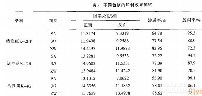 由表3可以看出.對于試驗選用的三種染料.測試指標的變化趨勢一致:ZW603的表面得色量和滲透性最高,3:7混合糊料次之.海藻酸鈉最差。這是 由于聚丙烯酸分子中的負性基團比藻酸鈉分子中的一COO一基團強得多,更有利于染料向纖維轉移。滲透性好則主要是因為ZW603糊料的粘度最低。