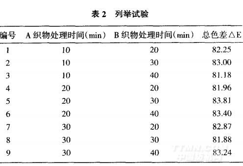 正交實驗 為了進一步比較超聲波處理織物和染液對織物上 染率的影響,分別選取織物進行超聲波處理的時間、染 液進行超聲波處理的時間進行試驗,各因素選取1.5中 單因素試驗上染率較優的兩變量進行正交試驗,表頭設 計如表1所示,以Na2s0 為促染劑,Na CO,為固色劑, 染色浴比為l:20,測定各組染色織物總色差△E值。列 舉試驗見表2。