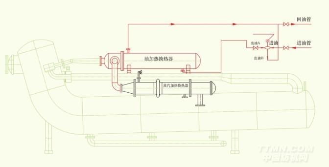 1.導(dǎo)熱油鍋爐的出油口和進(jìn)油口,通過(guò)油泵、油閥及油管與染色機(jī)導(dǎo)熱油加熱器筒狀殼體封蓋的進(jìn)油口和出油口連接成一個(gè)閉合的循環(huán)油路,對(duì)染液進(jìn)行加熱。