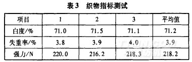 優(yōu)化工藝處理織物自度為71.2%,比傳統(tǒng)煮漂一浴法高7%,達(dá)到蹦TOl“8中1級(jí)標(biāo)準(zhǔn);強(qiáng)力218.2 N,達(dá)到蹦T72004.1_2000 l級(jí)標(biāo)準(zhǔn)。因此,最佳試驗(yàn)方案兼顧了白度、強(qiáng)力和失重,使三者同時(shí)處于較好的水平得到較好的處理效果。