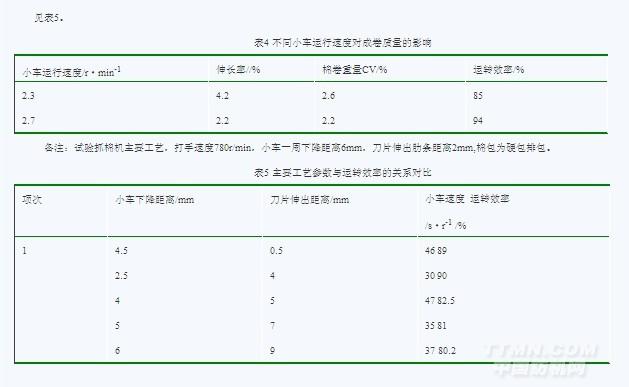 在確定抓棉機(jī)的運(yùn)轉(zhuǎn)效率時(shí),小車下降距離、小車運(yùn)行速度、打手速度、肋條伸出距離四者必須兼顧,缺一不可。控制時(shí)根據(jù)棉包的松緊程度,確定打手伸出肋條距離,依次確定打手速度、小車運(yùn)行速度、小車下降距離。具體微調(diào)時(shí),以調(diào)節(jié)小車運(yùn)行速度,此項(xiàng)調(diào)節(jié)可以兼顧質(zhì)量與效率。不同小車運(yùn)行速度對(duì)成卷質(zhì)量具體實(shí)踐對(duì)比見表4。主要工藝參數(shù)與運(yùn)轉(zhuǎn)效率的關(guān)系對(duì)比。