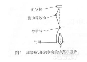 環錠紡細紗機前羅拉輸出的須條呈扁平狀,纖維沿紗條軸向平行排列,通過加捻,須條寬度逐漸收縮,兩側纖維也逐漸折疊而卷入紗條中心,形成加捻三角區。張文賡的加捻理論表明,在紡紗張力和加捻作用下,纖維產生向心壓力,而加捻三角區邊緣纖維和中心纖維在這種向心壓力的作用下不斷內外轉移,纖維頭端被擠出后,由于沒有張力及向心壓力的作用,不再移向紗條內部而留在紗的表面,成為毛羽。Hua Tao等對加捻三角區的力學研究顯示,由于纖維與前羅拉的摩擦作用,使傳統環錠紡加捻三角區呈現的是一種左右不對稱的形態。wang xungai等指出,在傳統環錠紡紡紗過程中,加捻三角區內的纖維受到預加捻作用,左右兩邊的纖維受力不均勻,從而提出在毛紡上采用錯位的方法來縮短左邊纖維運動到加捻集合點的距離。Thilagavathi通過重新設計羅拉滾花和吸棉笛管,實現了不同偏離量的左斜紗路。上述的錯位方法基本上都是錯位一個錠子,本試驗是在前羅拉鉗口至導紗鉤之間安裝了一個橫動導紗鉤裝置,通過調節橫動導紗鉤的位置,就可以形成不同偏移量的左斜或右斜紗路,實現位移量可控,我們稱這種紡紗方法為位移紡。加裝橫動導紗鉤后的紗路見圖1。