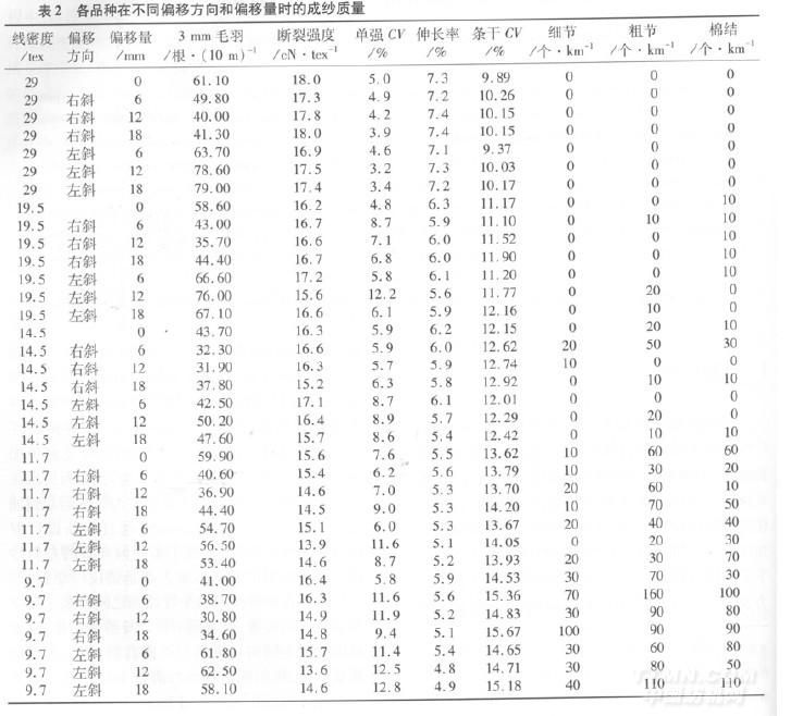 各品種在不同偏移方向和偏移量時的成紗質量見表2。