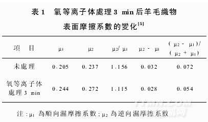 經過等離子體處理的羊毛纖維,用掃描電子顯微鏡觀察(放大3000倍)發現,鱗片主體基本完整,而多處鱗片尖角芒刺被打鈍,鱗片“起翹角”變小。進一步放大(10000倍)觀察,可見羊毛纖維鱗片表面在等離子體處理時被刻蝕的大量痕跡。這種表面微觀粗糙度的增加和纖維抱合時接觸面積的增加,導致了纖維表面摩擦系數的提高。表1為經氧等離子體處理3min后羊毛表面摩擦系數的變化。