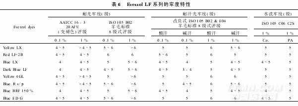 我公司近期推出之新一代高耐曬紅色活性染料EverzolRedLF2B,是一種不含金屬的專利染料,具有極高的耐曬牢度。為了符合紡織染整的實際需求,又推出一系列耐曬牢度極佳的染料搭配,以EverzolRedLF2B活性染料,配合Everzol高耐曬組合拼色時,可獲得鮮艷且優(yōu)良的耐曬牢度5~6級和耐汗曬牢度4~5級。同時還可符合各項濕牢度的基本要求(見表6)。