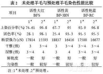3.3預處理后的羊毛染色勻染性及成品鮮艷度比未處理羊毛有所改善。