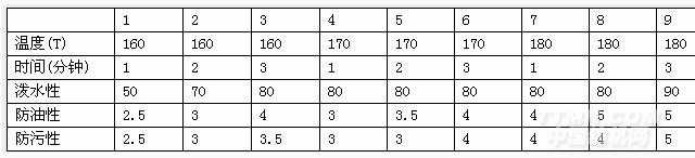 焙烘溫度和時間直接影響三防整理的效果,我們通過大量的實驗來確定用奧利氟寶C的生產工藝,具體見下表: