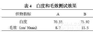 工藝:98℃×40min煮漂—水洗—烘干測(cè)定織物的白度和毛效,結(jié)果見表4。
