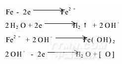采用兩個由薄鐵板制成的圓筒形消耗性電極。在電極之間加上適宜的直流電壓后,將電極置入需脫色的染料溶液內,電解槽內發生電化學反應。陽極板發生氧化反應,Fe失去2個電子變成二價鐵離子溶解進入電解液中;陰極板發生還原反應,水電解生成的氫離子得到2個電子變成氫氣;電解液中的2價鐵離子與水離解成的氫氧根離子生成大量氫氧化亞鐵。其大比表面積和高活性決定了它具有極強的吸附性,吸附廢水中的染料,達到廢水脫色的目的;電解液內另一部分氫氧根離子向陽極移動,并在陽極放電,生成新生態氧,它也是一種很好的脫色劑[2]。電解槽內發生的化學反應如下: