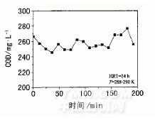 HRT=24h、MLSS=2000~2500mg/L,將已調(diào)至pH值為7,并濾去殘渣的原水進(jìn)行連續(xù)生化試驗。經(jīng)過96h的生化穩(wěn)定階段后,獲得穩(wěn)定的COD去除效果,而后進(jìn)入288h的正式生化階段,試驗結(jié)果見圖5。