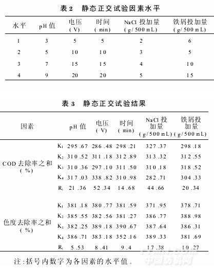 取廢水500mL,采用L16(45)正交表進行正交試驗因素、水平參照若干單色配制水處理工藝條件來確定分別是pH值、電解電壓、電解時間、NaCl投加量和內電解槽鐵屑投加量等五個因素,每因素取四個水平(見表2),每個試驗重復一次。取COD和色度去除率平均值作為評價指標對結果進行分析。試驗結果如表3。