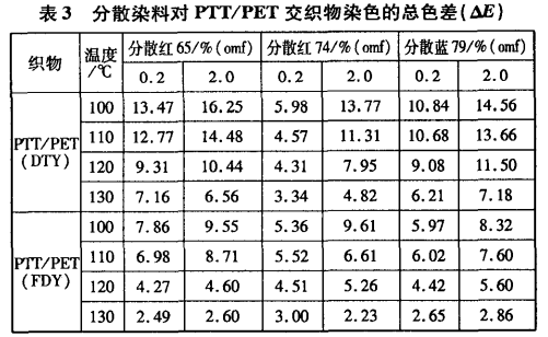 表3中,總色差沾綜合說明了亮度、彩度和色相對(duì)分散染料在交織物兩組分上引起的視覺差別。