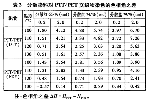 在交織物同色染色時(shí),并不是交織物中各組分K/S值相同或接近就能達(dá)到同色效果,還要求組分纖維的色相基本一致。表2列出了PTT/PET交織物染淺色和中深色時(shí),不同染色溫度下色相角的差值。