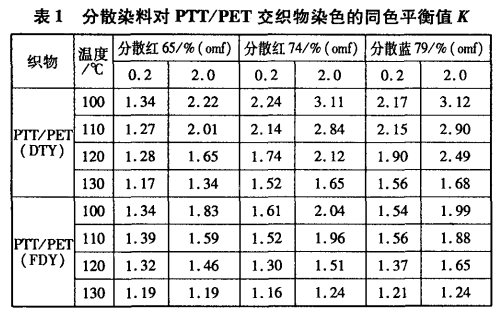綜合圖1、圖2和表1,在相同溫度下,分散染料用量為0.2%(owf)、PTT/PET交織物染色的K值均小于染料用量為0.2%時(shí)的K值,且更加接近1。這說明PTT/PET交織物分散染料染淺色時(shí),PTT組分與PET組分的表觀色深相差不大,易達(dá)到同色效果。而染中深色時(shí),PTT組分與PET組分的表觀色深差異較大,相對(duì)來說不易達(dá)到同色效果,而易達(dá)到濃淡色的效果。