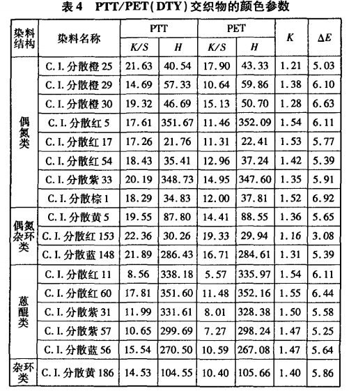 從表2和表3的數(shù)據(jù)中也可以看出,三只分散染料在PTT/PET(DTY)交織物兩組分上的色相角差和總色差均大于PTT/PET(FDY)交織物,這說明了FDY交織物的同色染色效果比DTY交織物好。