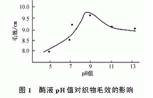 酶液pH值會影響酶蛋白的構象和酶分子及底物分子的解析狀態,從而影響酶的活性。實驗數據表明,當pH=8.5~9.0時,織物的毛效、白度、強度最佳。如pH值過低,酶的活力就低,且纖維素纖維不耐酸,織物有泛黃現象;如pH值過高,酶蛋白又會失去活力,因此,應控制酶液pH值為呈弱堿性,織物上的蠟質和脂肪類物質易分解,可保證酶蛋白起到最佳的催化作用,促進生化反應的正常進行。