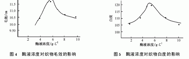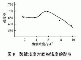 隨著酶液濃度的增加,反應速度逐漸增加,底物的有效轉化也增加,織物的毛效、白度、強度也隨之增加;但若酶液濃度過大,又會使棉纖維過度水解而產生崩解,影響織物的毛效、白度和強度。圖6表明,高濃度酶液使織物的強度損失最大。實驗表明,酶液濃度在6g/L左右時合適。